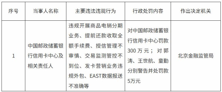国度金融监督贬责总局北京监管局公布的行政处罚信息表显现,邮储银行信用卡中心因存在违纪开展商品电销分期业务、提前还款收取全额手续费、授信贬责不审慎、交往监测管控不到位、发夹营销业务违纪外包、EAST数据报送不准确等问题,被处以罚金300万元。有关包袱东说念主郭涛、王世航、童勤三东说念主折柳被赐与训诫,并被各处罚金5万元。