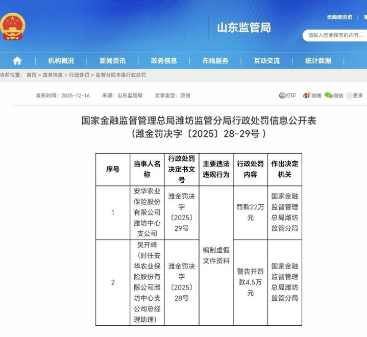 12月16日,国度金融监督解决总局潍坊监管分局发布行政处罚信息公开表(潍金罚决字〔2025〕28-29号),公开表裸露安华农业保障股份有限公司潍坊中心支公司因编制失实文献贵府被罚金22万元。同期,时任安华农业保障股份有限公司潍坊中心支公司总司理助理吴开峰因编制失实文献贵府,被警告并罚金4.5万元。