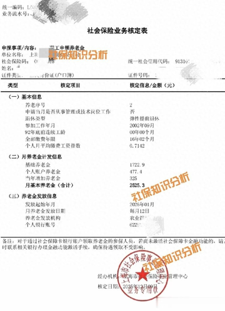 最近,一份上海养老保障待遇强项表激励了热议。表中显现,一位2002年投入使命、展望2026年退休的参保东谈主,在全部缴费年限仅16年2个月的情况下,强项月基本待业金为2525.3元。而最引东谈主注指标,是退休类型一栏写的 “弹性提前退休”。